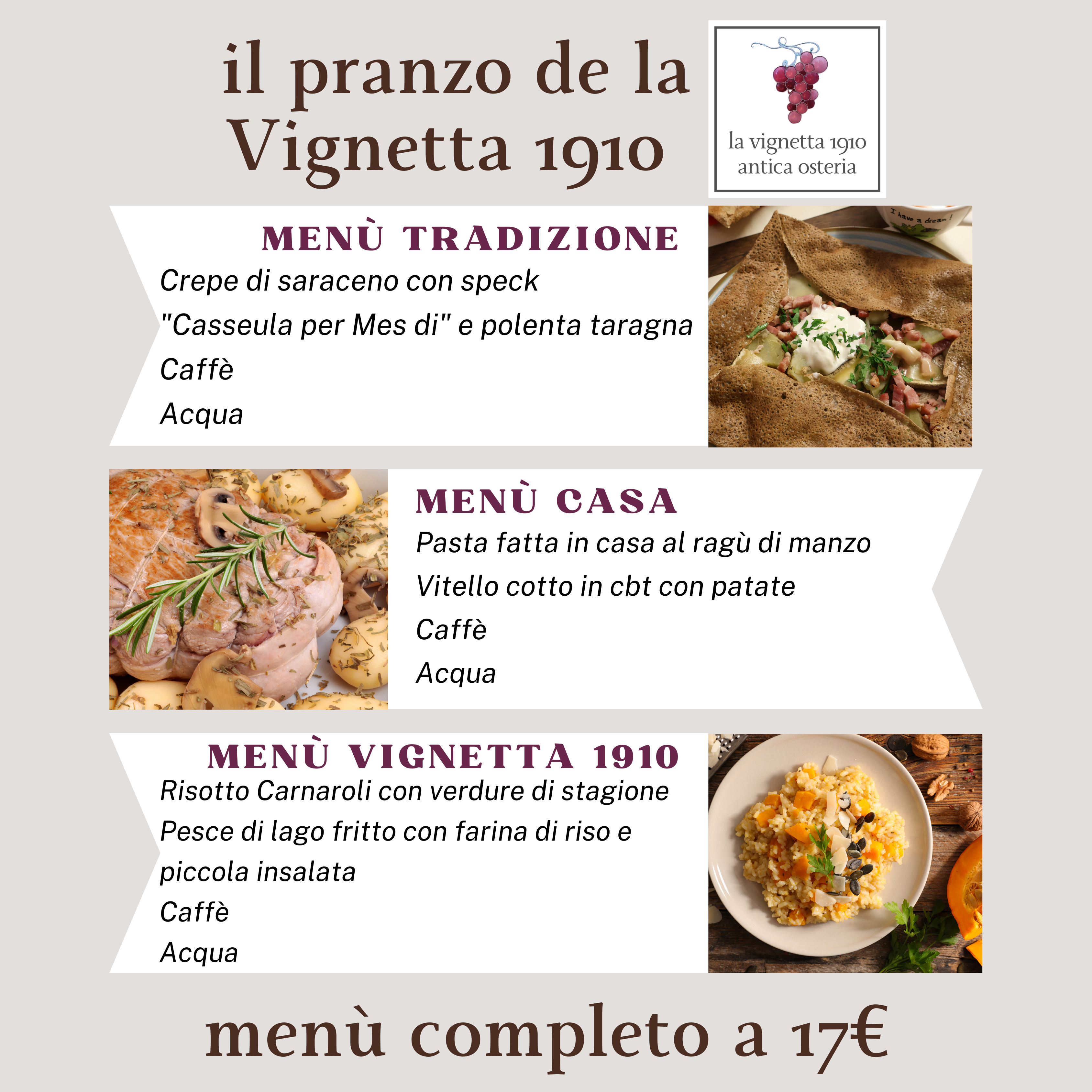 Un cammino iniziato nel 1910, fatto di passione, tradizione, qualità e sostenibilità. Protagoniste le nostre terre, le nostre montagne e i laghi. Una cucina attenta, essenziale e moderna: attenta alle tradizioni, all'innovazione ed alla straordinaria qualità dei prodotti; essenziale nel sapore e nella bellezza dei piatti; moderna come un’autentica osteria lombarda legata alle stagioni. Tutto accompagnato da buoni vini e da un’attenta selezione di cocktail da abbinare alle nostre proposte.